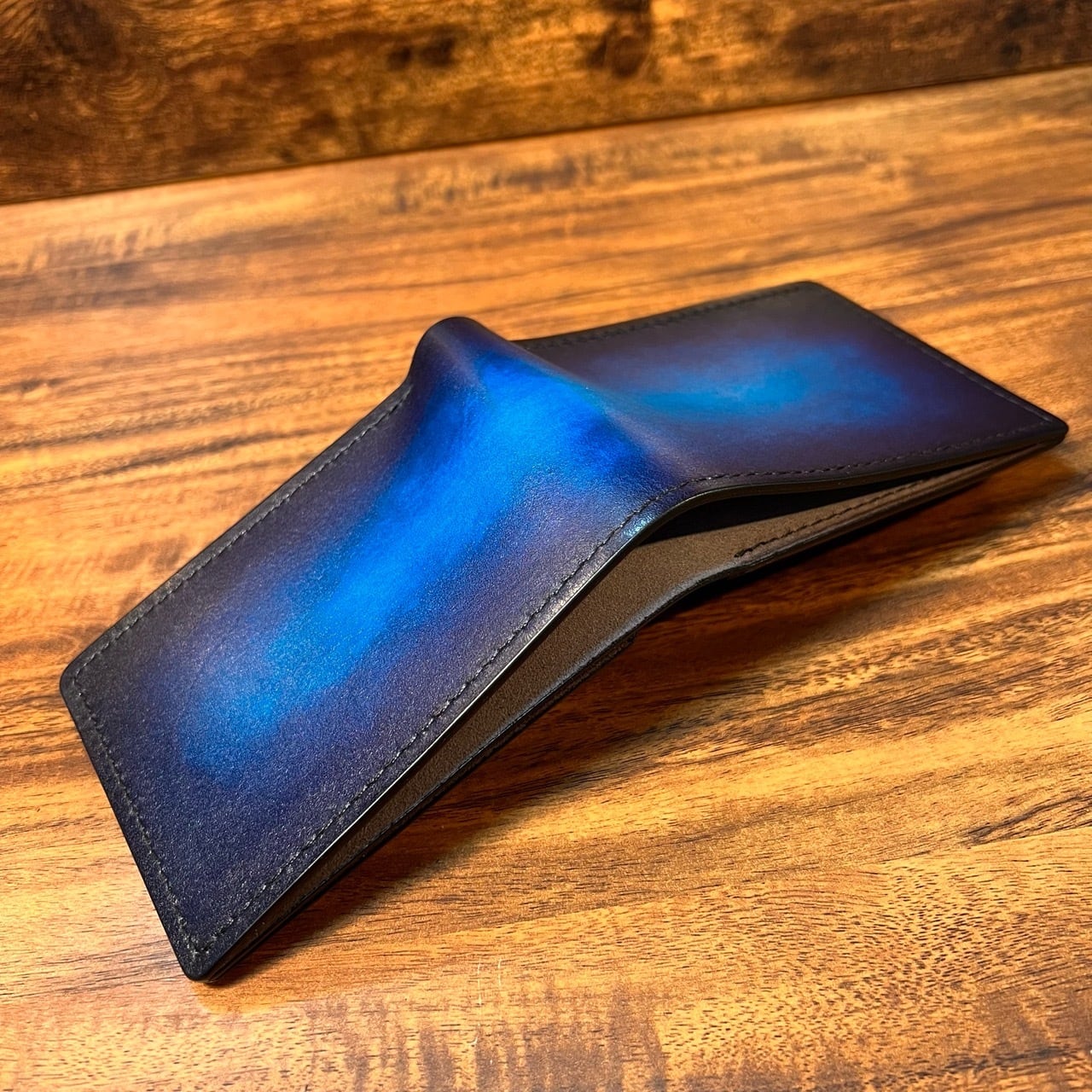 手染めの美しいグラデーションカラーで仕上げる二つ折り革財布です。