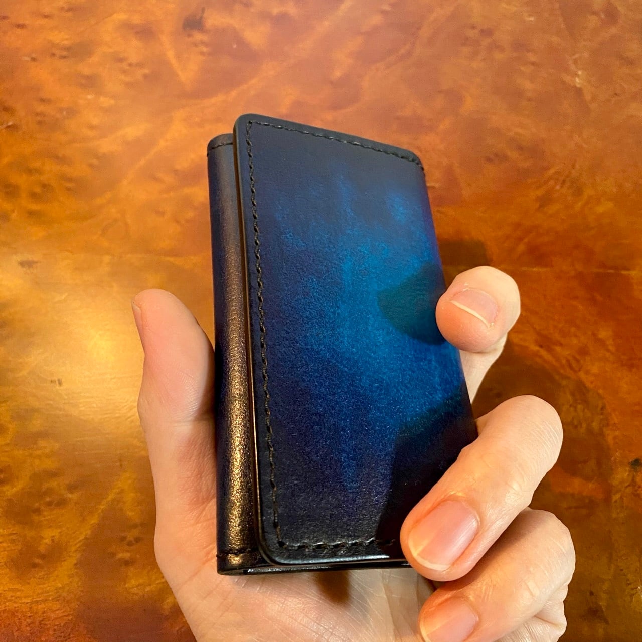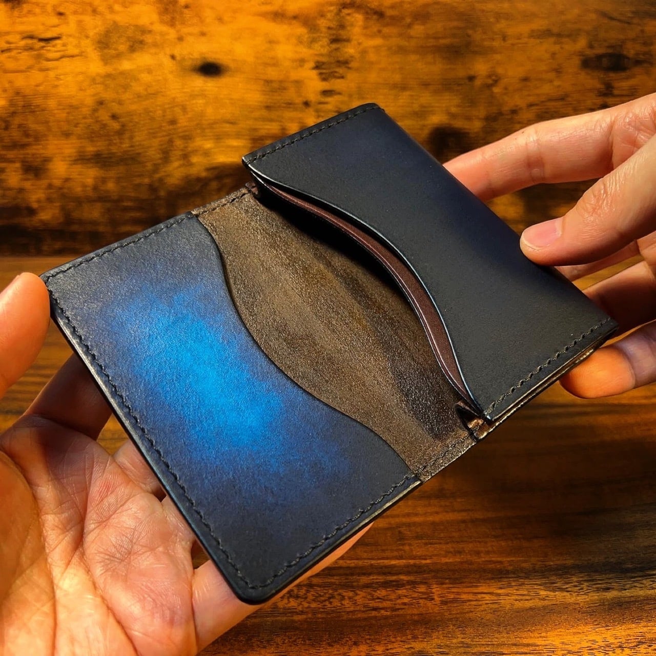 天然の本革に、一から手染めをして名刺入れをお作りします。